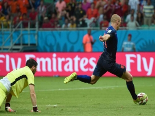 5 Fotos. Um para cada gol da Holanda diante da Espanha. Nunca antes na histórias da Copas um campeão mundial foi tão humilhado. Foi um baile mas só no segundo tempo. A partida era boa e tinha níveis de tensão. Diego Costa sendo, injustamente, vaiado. A Holanda teve uma chance com Sneijder, mas Casillas - sempre ele devem ter pensado os holandeses - salvou. Logo depois o árbrito - sempre eles - deram uma mãozinha ao marcar um penalty no mínimo duvidoso.